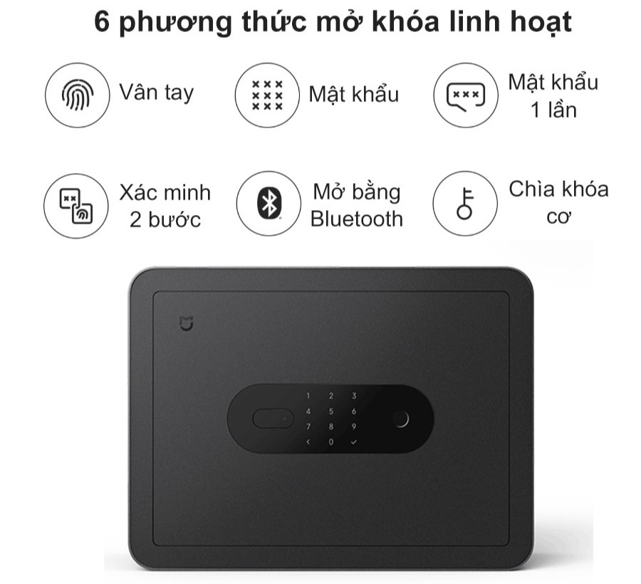 Ngoài vân tay AI 3D, két sắt vân tay Xiaomi Mijia BGX-5/X1-303 còn hỗ trợ mở khóa bằng mật khẩu dài hạn (tối đa 50 nhóm), mật khẩu dùng một lần, mật khẩu ảo (chống nhìn trộm), xác thực hai lớp (vân tay + mật khẩu), kết nối Bluetooth hoặc chìa khóa cơ. Thiết kế này giúp người dùng linh hoạt trong từng tình huống sử dụng, từ cá nhân đến chia sẻ an toàn với người thân.