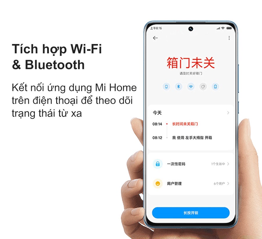 Nhờ tích hợp cả Wi-Fi và Bluetooth, người dùng có thể kết nối két với ứng dụng Mi Home trên điện thoại để theo dõi trạng thái từ xa. Ứng dụng cho phép kiểm tra lịch sử mở khóa, kiểm tra trạng thái cửa, cảnh báo bất thường và điều khiển từ xa mọi lúc, mọi nơi. Đây là điểm cộng nổi bật giúp nâng cao tính an toàn và tiện ích.