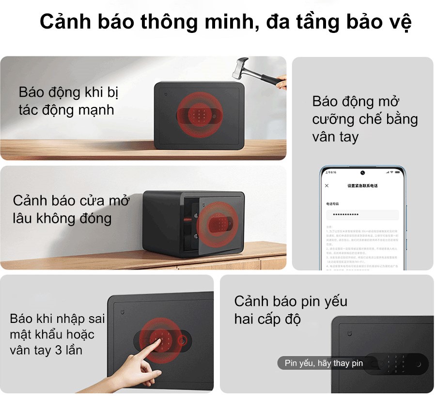 Két sắt vân tay Xiaomi Mijia BGX-5/X1-303 được trang bị nhiều lớp cảnh báo an toàn gồm: báo động khi bị tác động mạnh, báo khi nhập sai mật khẩu hoặc vân tay 3 lần, báo động cưỡng ép nếu bị ép mở két bằng vân tay định sẵn, cảnh báo cửa mở lâu không đóng và cảnh báo pin yếu hai cấp độ. Mọi cảnh báo sẽ được đẩy lên ứng dụng Mi Home giúp người dùng kịp thời xử lý tình huống.