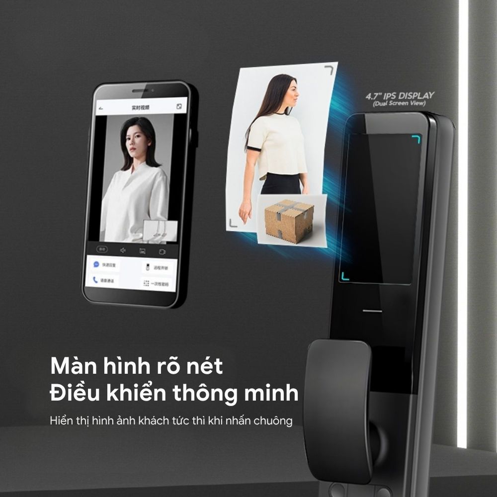 Khi có ai đó đến và nhấn chuông đã được tích hợp sẵn trên thân khóa, hình ảnh sẽ ngay lập tức hiển thị lên màn hình lớn 4.7 inch siêu nét bên trong nhà, đồng thời gửi thông báo đến ứng dụng điện thoại của bạn. Bạn có thể dễ dàng đàm thoại 2 chiều và quyết định mở cửa từ xa, dù bạn đang ở bất cứ đâu.