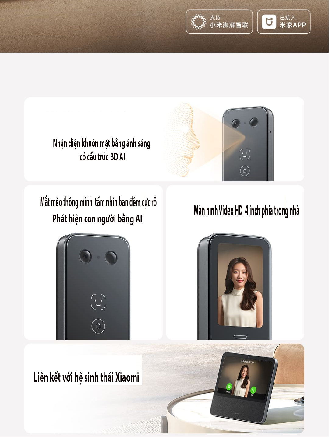 - Cách mở cửa : nhận diện khuôn mặt, vân tay, mật mã, mật mã tạm thời, Bluetooth, thẻ từ NFC ( mua thêm) ,điện thoại xiaomi, đồng hồ xiaomi, vòng đeo tay xiaomi.