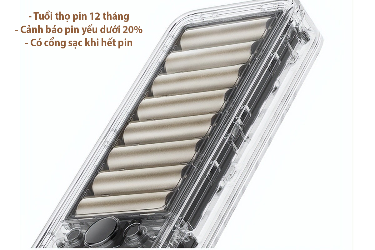 Về thời lượng pin, khóa cửa được cung cấp năng lượng bởi 8 pin khô kiềm có thời lượng pin lên đến 1 năm; được trang bị chức năng nhắc nhở pin yếu. Nếu pin đã hết hoàn toàn, bạn cũng có thể sử dụng bộ sạc dự phòng Type-C để cung cấp nguồn điện khẩn cấp cho khóa cửa để hoàn tất việc mở khóa tạm thời.