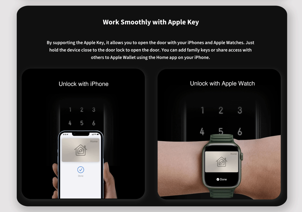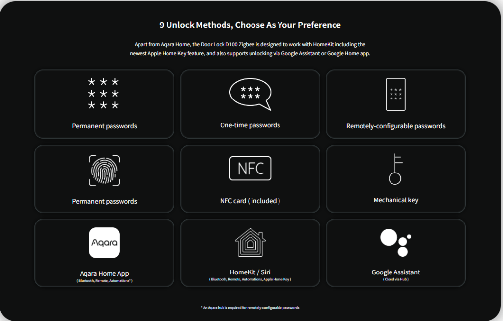 Giải Pháp Tối Ưu Cho An Ninh Ngôi Nhà Hiện Đại. Khóa Cửa Thông Minh Tiên Tiến Này Kết Hợp Công Nghệ Tiên Tiến Với Thiết Kế Đẹp Mắt, Mang Đến Cho Bạn Sự Tiện Lợi, An Tâm Và Tăng Cường Bảo Vệ Cho Ngôi Nhà Của Bạn. Khóa cửa vân tay Aqara là khóa cửa thông minh rất an toàn có thiết kế tiện dụng và nhiều tính năng thông minh mở rộng. Nó hỗ trợ nhiều cách để mở khóa: dấu vân tay sinh trắc học, mã PIN cá nhân, thẻ NFC và phím cơ. Nó cũng cho phép thiết lập mã pin tạm thời sử dụng một lần và mã pin định kỳ . Khả năng mới bao gồm hỗ trợ Apple Home Key * để bạn chỉ cần chạm vào điện thoại hoặc xem trên khóa cửa để mở khóa. Một số chức năng thậm chí có thể được quản lý từ xa*.