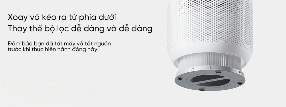Không như nhiều bộ phận phức tạp khác, lõi máy lọc Xiaomi Smart Air Purifier 4 Compact hoàn toàn có thể được người dùng thay thế một cách dễ dàng và đơn giản. Để tiến hành thay lõi lọc, bạn chỉ cần thực hiện động tác xoay và kéo bộ lọc (đang lắp sẵn trong máy lọc không khí) từ phía dưới ra. Tuy nhiên, một điểm bạn cần lưu ý đó là trước khi tháo lõi lọc cần tiến hành tắt máy, tắt nguồn để đảm bảo an toàn.
