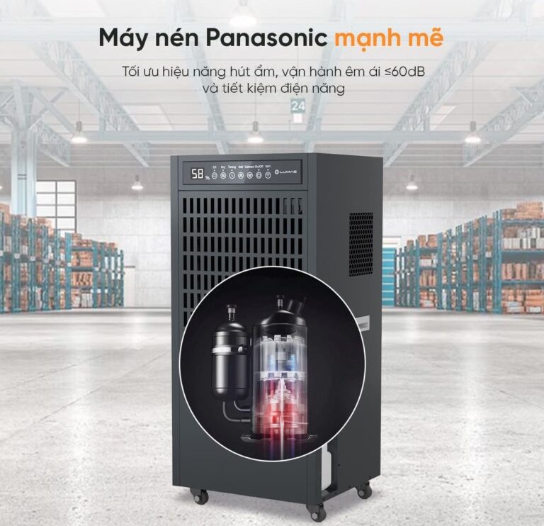 Lumias LID-S150 được trang bị máy nén Panasonic chất lượng cao, đóng vai trò cốt lõi trong việc duy trì hiệu suất hút ẩm ổn định suốt quá trình vận hành. Nhờ công nghệ nén tối ưu, thiết bị có khả năng tách ẩm nhanh hơn, đồng thời giảm mức tiêu thụ điện năng so với các dòng máy hút ẩm thông thường.