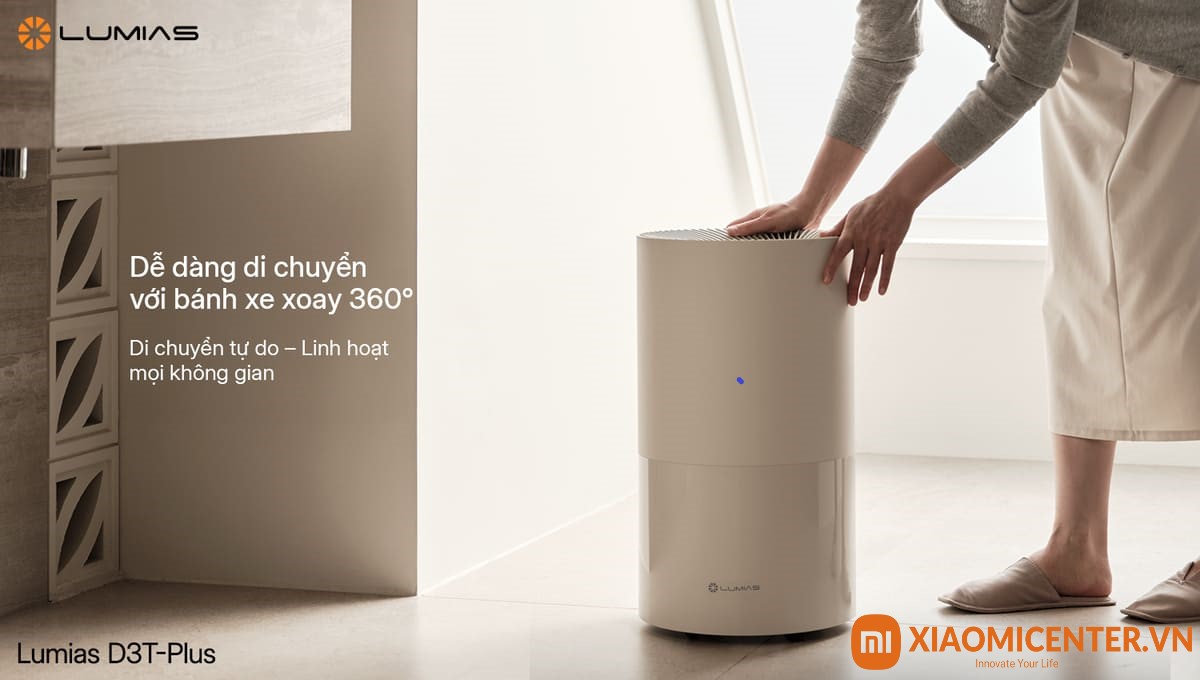 Lumias D3T-PLUS sở hữu thiết kế hình trụ hiện đại với kích thước nhỏ gọn, dễ dàng bố trí trong phòng ngủ, phòng khách hoặc phòng làm việc. Thiết kế bánh xe xoay 360°, hỗ trợ di chuyển nhẹ nhàng giữa các khu vực trong nhà. Nhờ khả năng di chuyển tự do, thiết bị thích ứng tốt nhiều không gian sử dụng khác nhau, tiện lợi trong sinh hoạt hàng ngày. Màn hình LED cảm ứng trực quan giúp kiểm soát chế độ và độ ẩm nhanh chóng, dễ sử dụng cho mọi thành viên trong nhà.