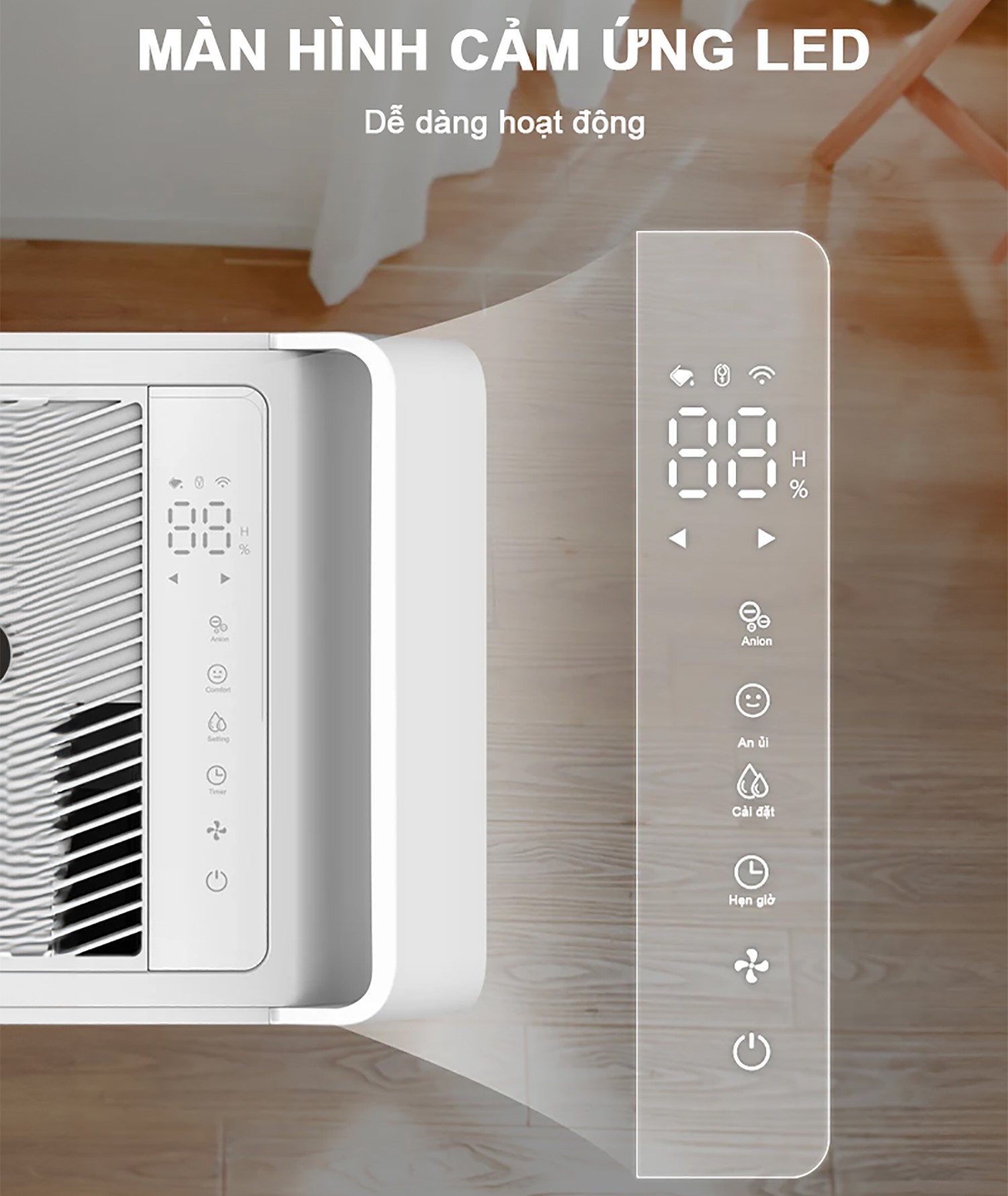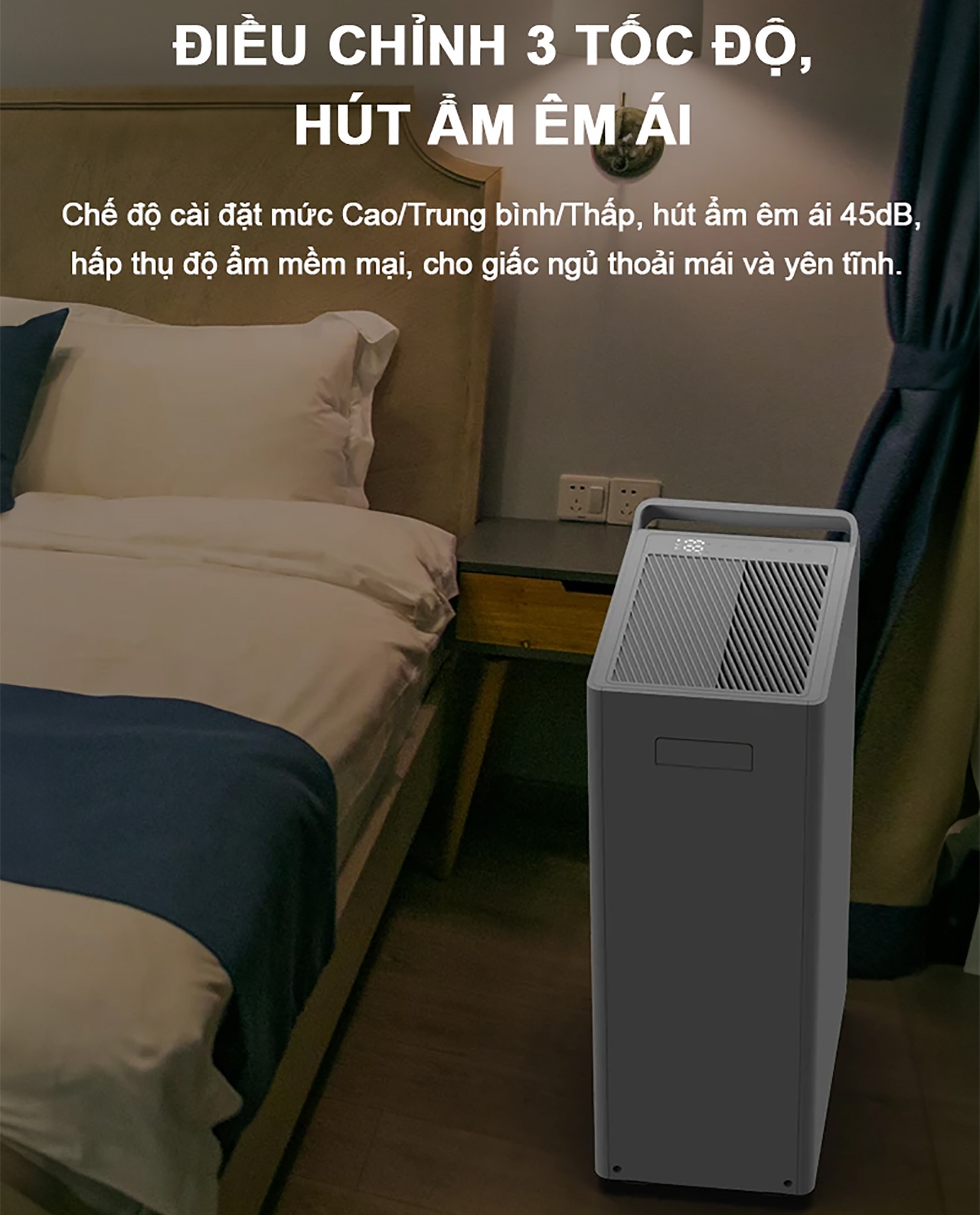 Chế độ hút ẩm ban đêm: máy sẽ hoạt động với độ ồn thấp hơn và ánh sáng mờ để không làm ảnh hưởng hay gián đoạn giấc ngủ của gia đình.