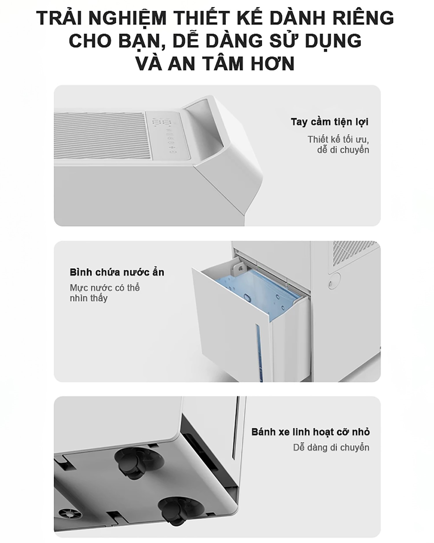Sự tiện lợi của Lumias LMD-20L thể hiện ở phần tay cầm và bánh xe xoay linh hoạt. Nhờ đó, mặc dù máy có khối lượng 15kg nhưng người dùng có thể dễ dàng di chuyển vị trí sử dụng mà không mất nhiều công sức. Chỉ cần một thiết bị nhưng bạn có thể sử dụng được cho nhiều phòng trong nhà, tiết kiệm đáng kể chi phí mua sắm.