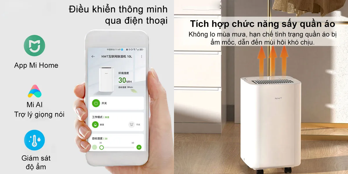 Là sản phẩm thuộc hệ sinh thái Xiaomi, máy hút ẩm Widetech WDH27B10FW hỗ trợ điều khiển từ xa qua ứng dụng Mi Home trên smartphone. Người dùng có thể theo dõi độ ẩm trong phòng, bật/tắt thiết bị, hẹn giờ hoạt động tối đa 12 giờ, hoặc tùy chỉnh chế độ phù hợp ngay cả khi không có mặt tại nhà. Đây chính là yếu tố giúp máy trở thành lựa chọn lý tưởng trong xu hướng nhà thông minh hiện nay.