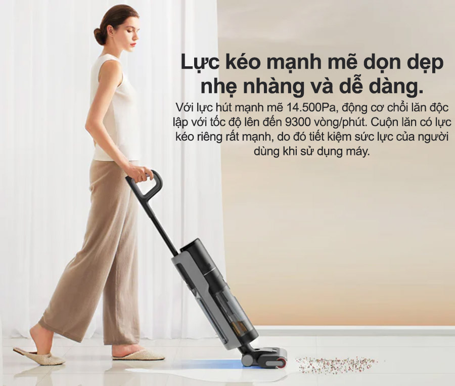 Cuộn lăn của Dreame H12 Pro có lực kéo riêng rất mạnh, nhờ đó sẽ giúp tiết kiệm sức lực của người dùng khi sử dụng máy. Dreame cũng đặc biệt chú trọng đến việc tối ưu hóa trọng lượng của Dreame H12 Pro. Mặc dù có trọng lượng chỉ 4,9kg và thiết kế nhỏ gọn hơn, nhưng máy sẽ dùng chính trọng lượng này để tạo lực ép đủ lớn lên mặt sàn, đảm bảo hiệu quả làm sạch tốt hơn.