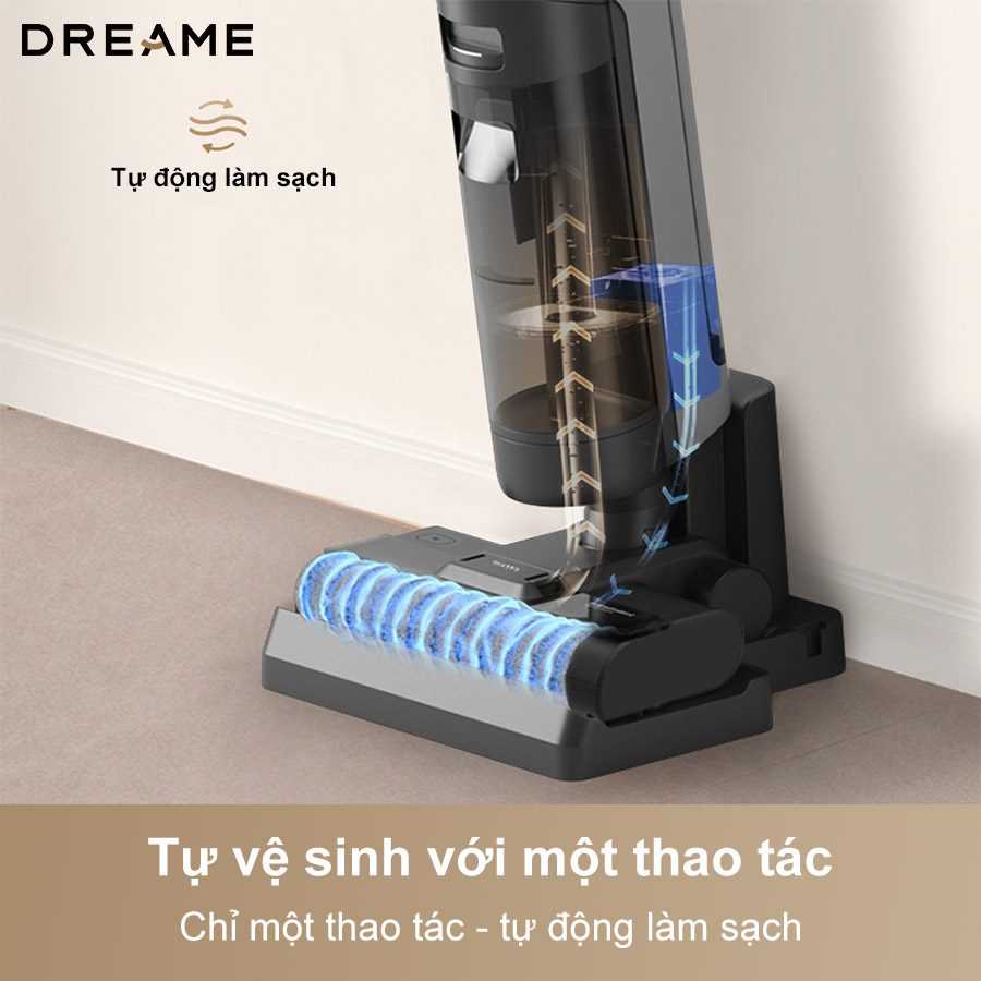 Dreame H12S AE không chỉ hút bụi mà còn kết hợp lau nhà hiệu quả, giúp sàn nhà luôn sạch bóng trong một lần di chuyển. Sau khi sử dụng, cuộn lăn được làm sạch tự động chỉ bằng một nút bấm, tiết kiệm thời gian và công sức cho người dùng.
