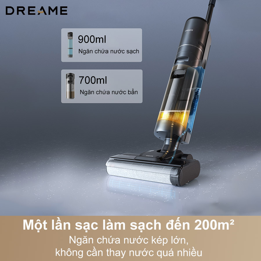 Thiết bị được trang bị hai bình chứa riêng biệt: bình nước sạch 900ml và bình nước bẩn 700ml, giúp hạn chế tối đa việc gián đoạn trong quá trình lau dọn. Cơ chế tách nước thông minh này đảm bảo hiệu quả vệ sinh tối ưu.