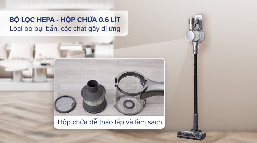 Máy hút bụi Dreame R20 còn có cơ chế đóng kín khí thải kết hợp van một chiều và khớp nối kiến giúp không khí đi qua toàn bộ hệ thống lọc rồi mới thoát ra, loại bỏ tận gốc vi khuẩn, phấn hoa và lông thú. Khi cần đổ rác, chỉ với một nút nhấn, hộp chứa 600ml mở ra tự động mà không làm bụi vương vãi, đồng thời các màng lọc có thể tháo rời, rửa sạch và tái sử dụng dễ dàng.