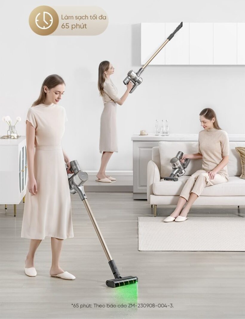 Máy hút bụi cầm tay V12S sở hữu viên pin dung lượng lớn 7x3000mAh, cho phép thiết bị vận hành liên tục lên đến 65 phút ở chế độ tiêu chuẩn. Nhờ đó, bạn có thể dọn dẹp toàn bộ căn nhà chỉ với một lần sạc mà không lo gián đoạn.