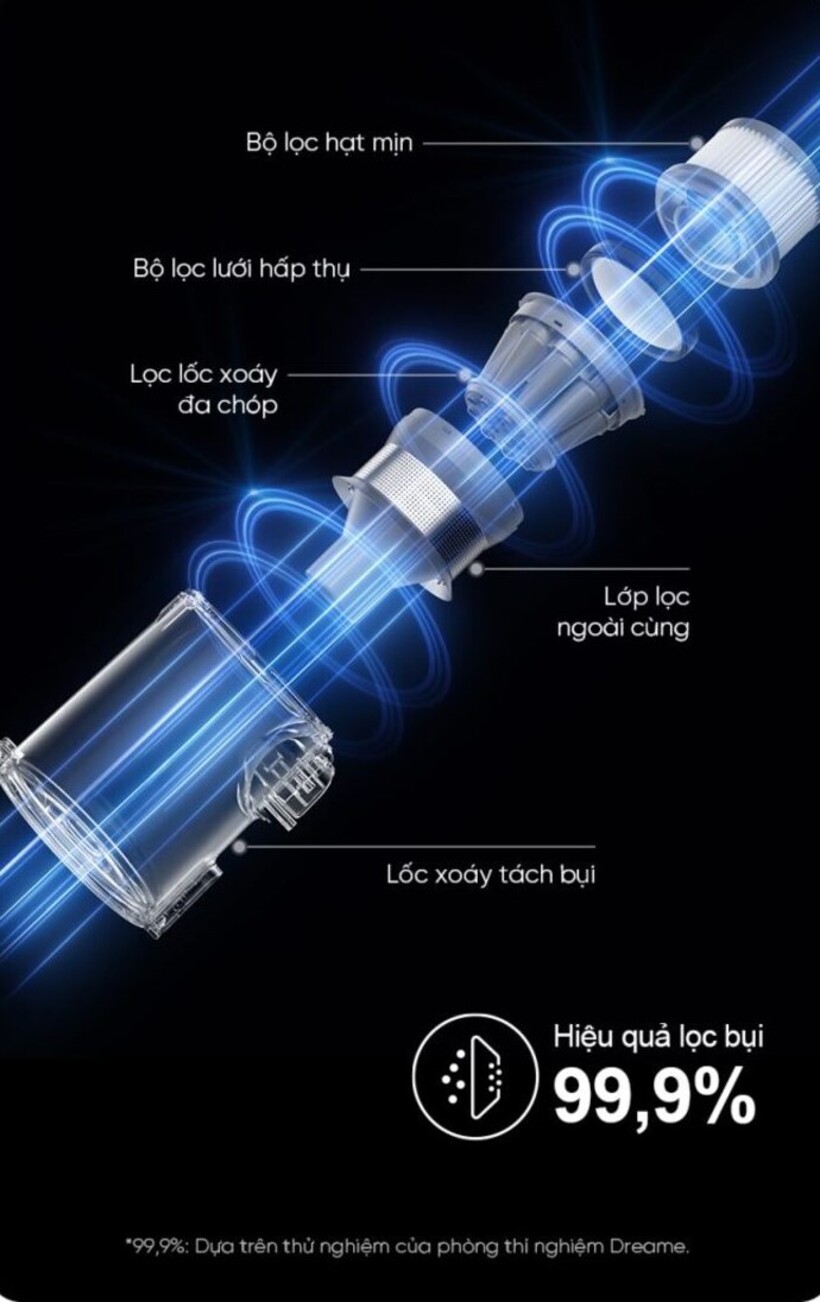 - Bộ lọc hiệu quả: Dreame V12S còn giữ chặt 99,9% bụi bẩn và bụi mịn, bảo vệ sức khỏe của cả gia đình.