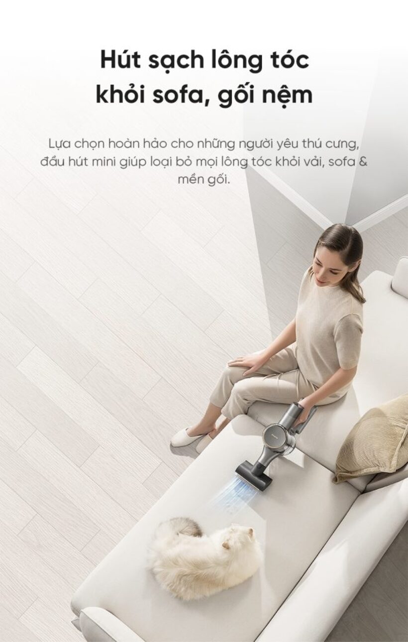Đặc biệt, đầu hút mini có con lăn là “trợ thủ” lý tưởng cho gia đình nuôi thú cưng, giúp thu gom lông chó mèo hiệu quả, ngăn ngừa bụi gây dị ứng. Kết hợp cùng đầu hút có lông chổi và đầu chổi mềm, Dreame V12S dễ dàng quét sạch mọi bụi bẩn li ti hay mảnh vụn trên các bề mặt nhạy cảm.