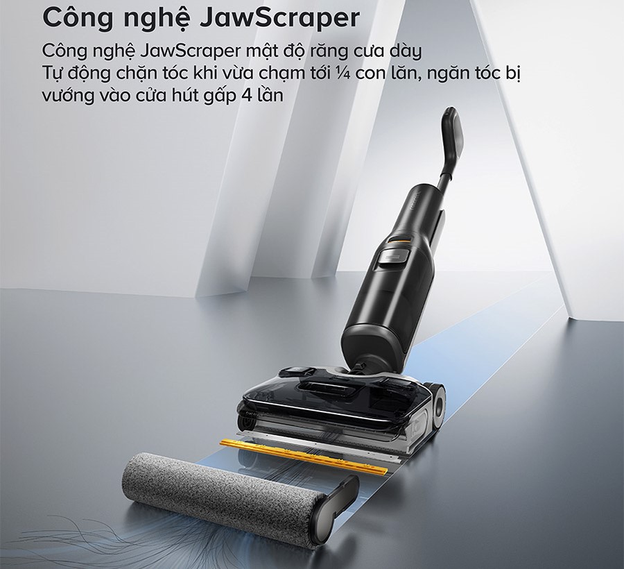 Với công nghệ JawScraper hiện đại, máy ngăn chặn tóc bị vướng vào cửa hút hiệu quả gấp 4 lần so với thiết kế thông thường. Điều này được thực hiện nhờ thiết kế răng cưa dày hơn 70%, với 141 răng gỡ rối thông minh. Thiết bị cũng tự động chặn tóc ngay khi chạm tới 1/4 con lăn, đảm bảo quá trình làm sạch không bị gián đoạn và tiết kiệm thời gian xử lý thủ công.