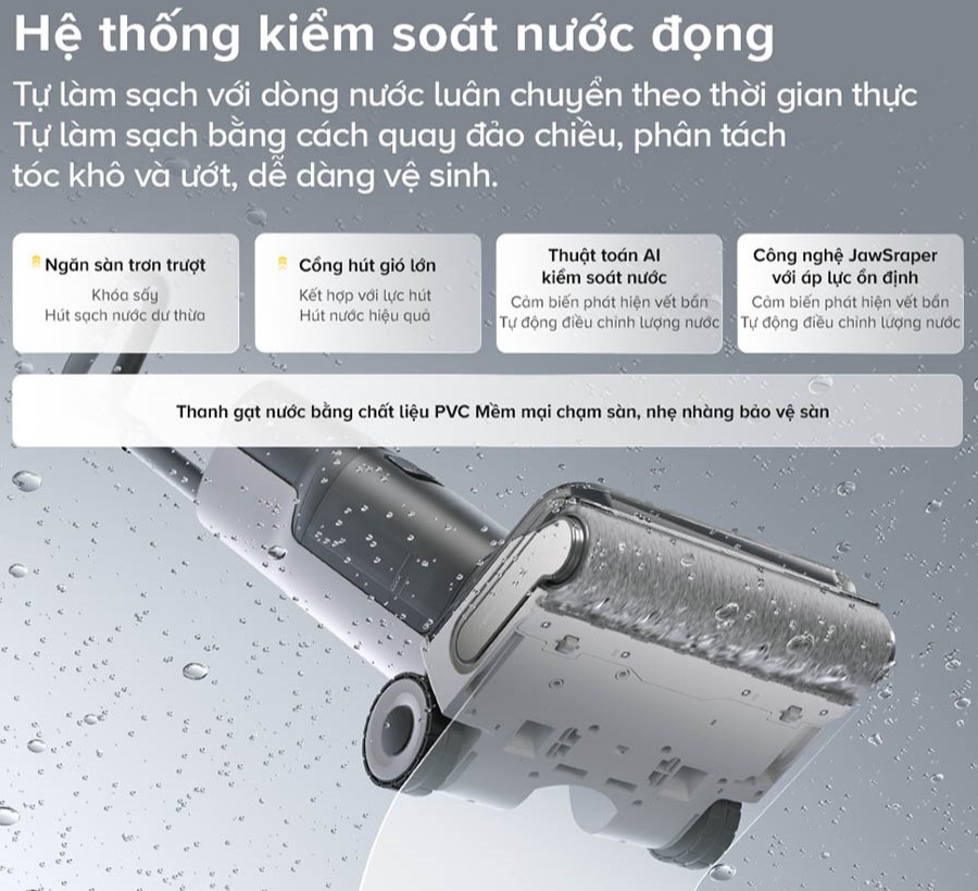 Roborock F25 tích hợp hợp hệ thống kiểm soát nước đọng thông minh, giúp ngăn chặn tình trạng nước dư làm trơn trượt sàn nhà. Dòng nước được luân chuyển theo thời gian thực, kết hợp với cơ chế xoay đảo chiều, thanh gạt nước bằng PVC mềm mại làm sạch nhẹ nhàng nhưng không kém phần triệt để. Đặc biệt, cổng hút gió lớn cùng chức năng hút nước dư hiệu quả giúp sàn nhà khô thoáng sau mỗi lần lau. Hệ thống này còn được trang bị thuật toán AI thông minh, giúp phát hiện và điều chỉnh lượng nước phù hợp cho từng loại vết bẩn.