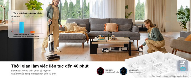 Dung lượng pin của Tineco S6 Stretch Pro lớn, cho khả năng hoạt động liên tục lên đến 40 phút. Điểm ấn tượng hơn chính là bình chứa nước sạch và bẩn có dung tích lớn, cụ thể bình chứa nước sạch 800ml và 700ml, cho quá trình làm sạch toàn bộ căn phòng được diễn ra trơn tru mà không bị gián đoạn. Bạn sẽ không còn phải lo lắng về việc máy bị hết pin giữa chừng và hạn chế tối đa các thao tác thủ công.