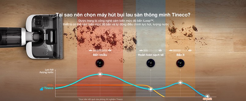 Công nghệ cảm biến iLoop™ độc quyền của Tineco Floor One S6 Stretch Pro sẽ theo dõi liên tục và phân tích mức độ nghiêm trọng của vết bẩn trên sàn nhà. Từ đó, máy sẽ tự động điều chỉnh chế độ hút và lượng nước xả ra hợp lý, giúp quá trình làm sạch nhanh chóng hơn mà vẫn đảm bảo hiệu quả cao. Khi gặp các vết bẩn cứng đầu, máy sẽ tăng công suất làm sạch, còn khi sàn đã sạch, hệ thống sẽ tự động giảm lực hút để tiết kiệm năng lượng.
