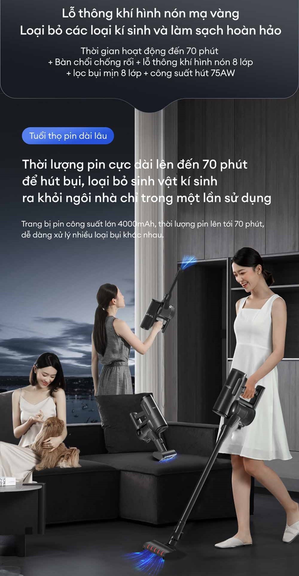 Với pin dung lượng lớn 4000mAh, máy có thể hoạt động liên tục tối đa 70 phút, đủ sức làm sạch toàn bộ căn hộ chỉ trong một lần sạc. Đây là giải pháp lý tưởng cho gia đình có diện tích lớn, nuôi thú cưng hoặc cần dọn dẹp thường xuyên.