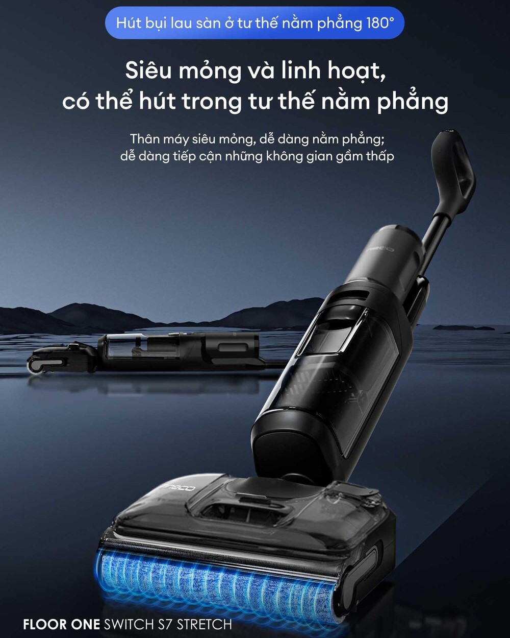Với chiều cao thân máy chỉ 13cm khi nằm phẳng và con lăn cao 10cm. Tineco Switch S7 Stretch dễ dàng chui vào gầm giường, ghế sofa, gầm tủ,... những khu vực thường xuyên bị bỏ quên trong quá trình vệ sinh. Thiết kế thông minh cho phép máy nằm phẳng linh hoạt 180° mà vẫn duy trì khả năng hút và lau hiệu quả.