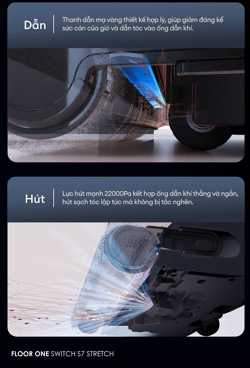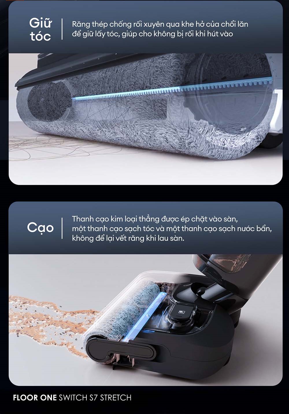Một trong những cải tiến đáng giá nhất trên Tineco Switch S7 Stretch chính là hệ thống chống rối tóc đa tầng phía trước, giúp giải quyết triệt để vấn đề rối tóc - nguyên nhân phổ biến khiến nhiều máy hút bụi nhanh hư hỏng hoặc giảm hiệu suất.
