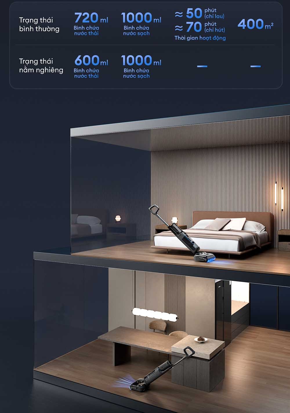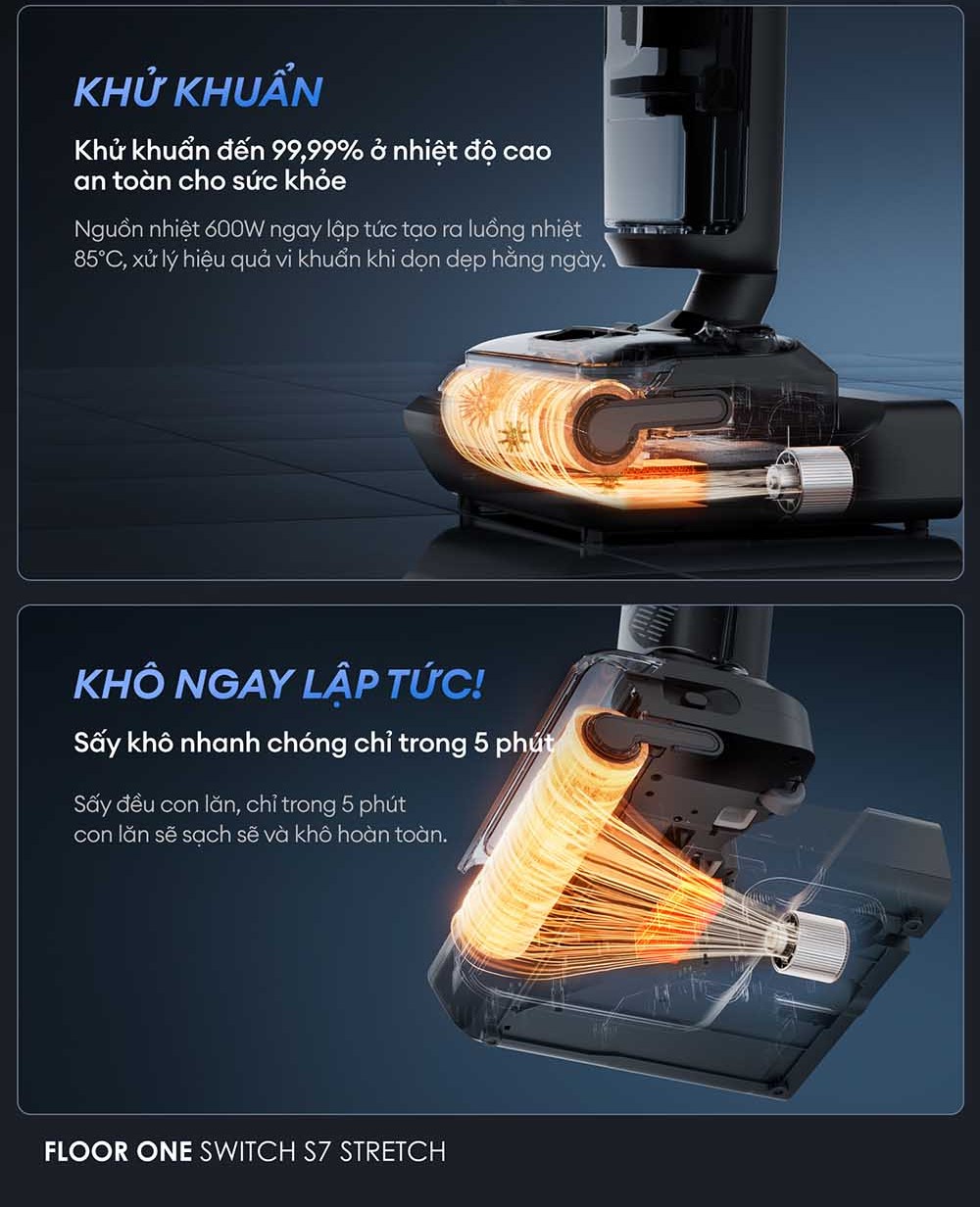 Công nghệ này không chỉ giúp phân phối nước đều trong suốt quá trình lau mà còn hút sạch hoàn toàn lượng nước dư thừa, đảm bảo sàn luôn khô thoáng và sạch sẽ sau khi sử dụng. Khả năng làm sạch đồng thời cả vết bẩn khô và ướt mang đến hiệu quả vượt trội, tiết kiệm thời gian hơn so với các thiết bị vệ sinh truyền thống.