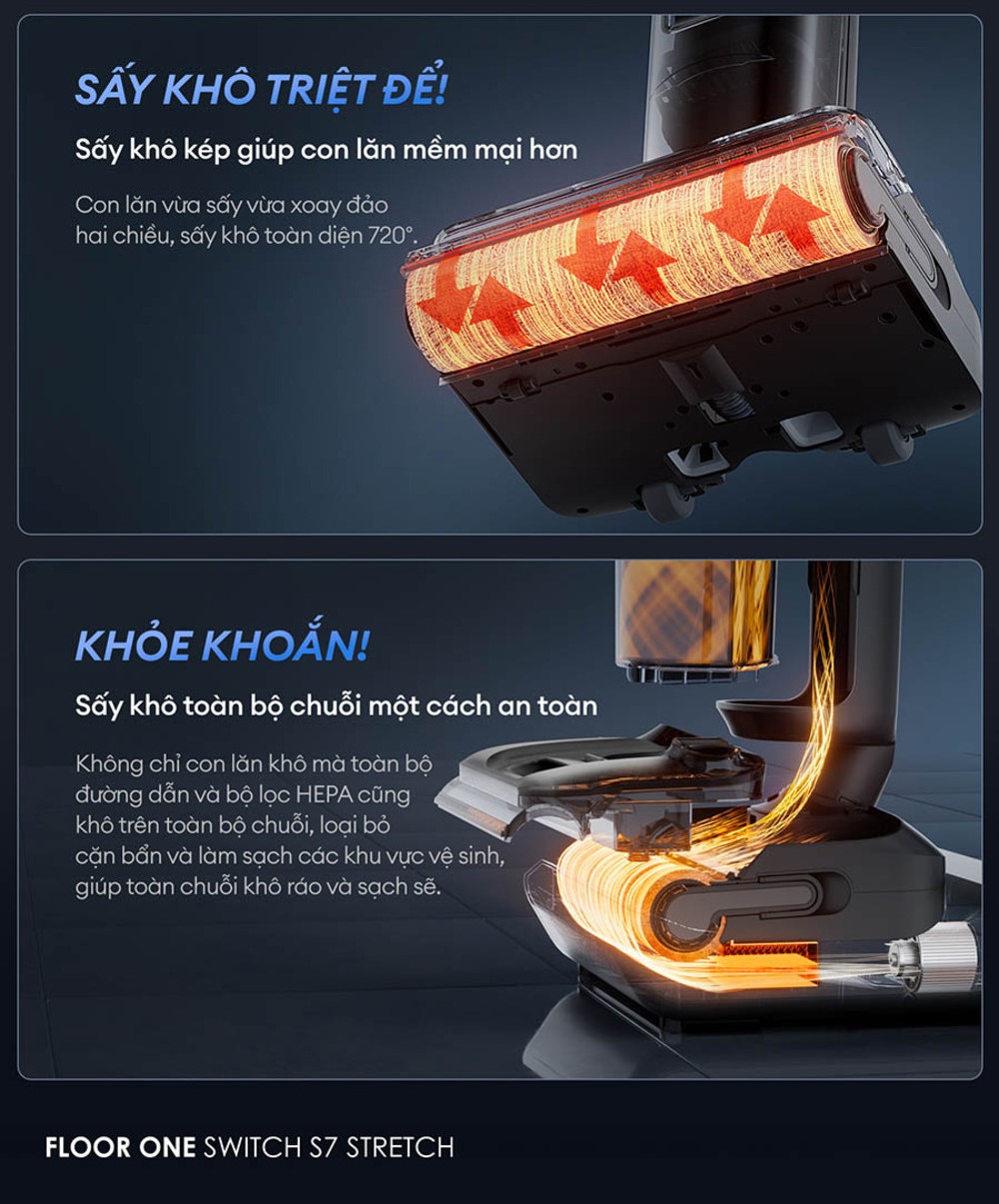 Sau quá trình vệ sinh, hệ thống sấy khô kép sẽ tự động kích hoạt để đảm bảo toàn bộ thiết bị luôn khô ráo và sạch sẽ chỉ trong 5 phút. Con lăn sẽ vừa sấy vừa xoay đảo hai chiều, mang đến hiệu quả sấy khô toàn diện 720°, đồng thời giúp giữ cho con lăn luôn mềm mại, bền bỉ và không bị ám mùi ẩm mốc sau thời gian dài sử dụng.
