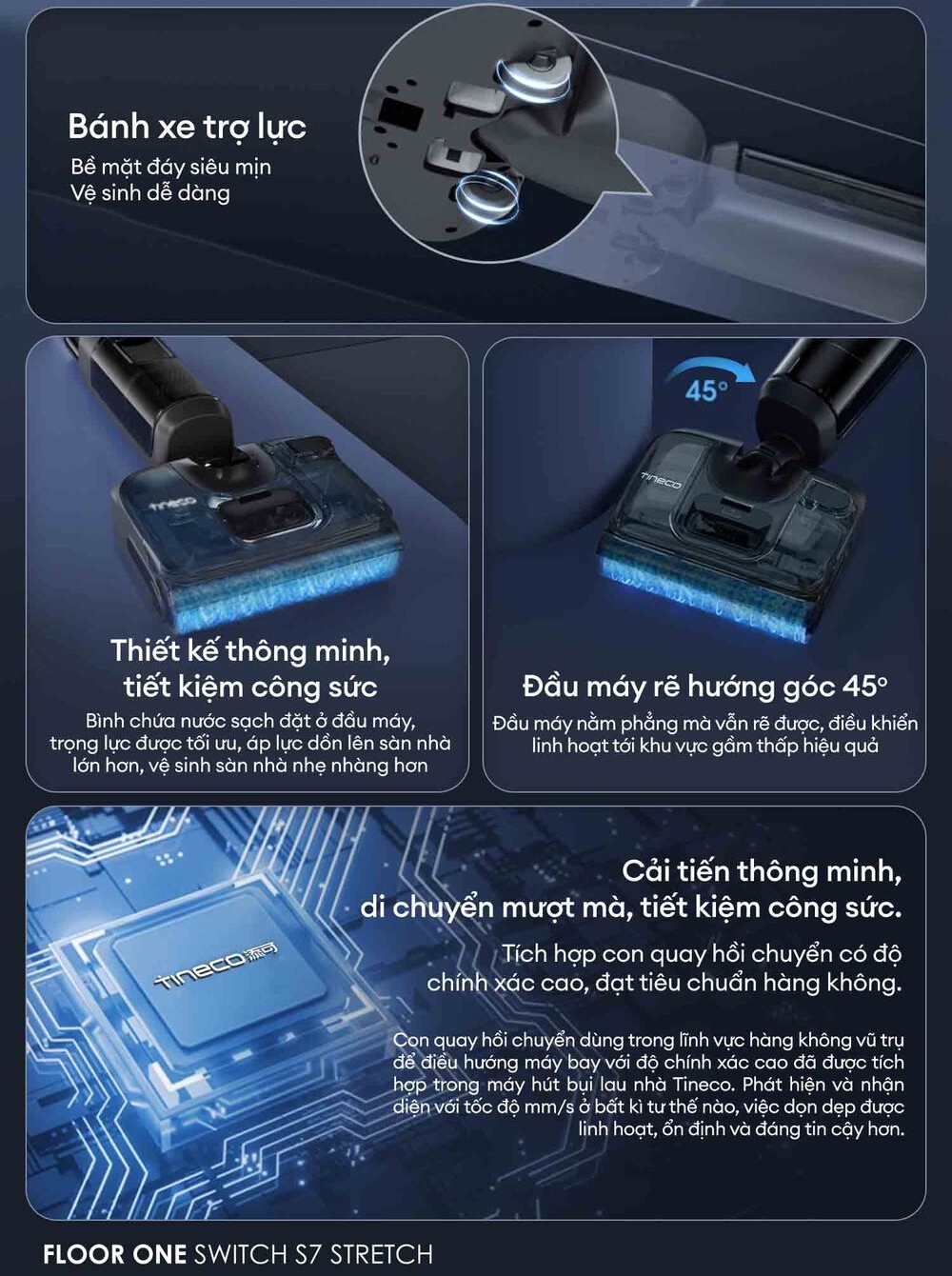 Tineco trang bị cho sản phẩm Tineco Floor One Switch S7 cảm biến con quay hồi chuyển – công nghệ thường được sử dụng trong hàng không vũ trụ – giúp máy phát hiện chuyển động ở cấp độ mm/s, điều hướng chính xác và ổn định hơn trong mọi tư thế.