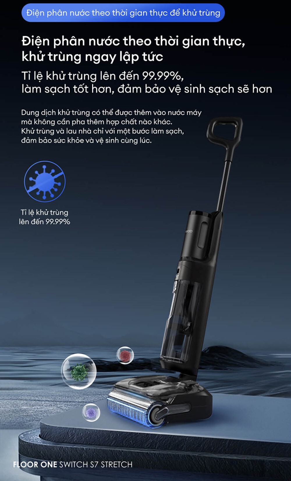 Khác biệt với các dòng máy thông thường, Tineco Floor One Switch S7 sử dụng công nghệ điện phân nước theo thời gian thực, tạo ra dung dịch khử trùng trực tiếp từ nước máy – không cần pha chế phức tạp. Tỷ lệ khử khuẩn đạt tới 99,99%, loại bỏ vi khuẩn, nấm mốc và các tác nhân gây hại, giúp sàn nhà luôn sạch khuẩn và an toàn cho cả gia đình.
