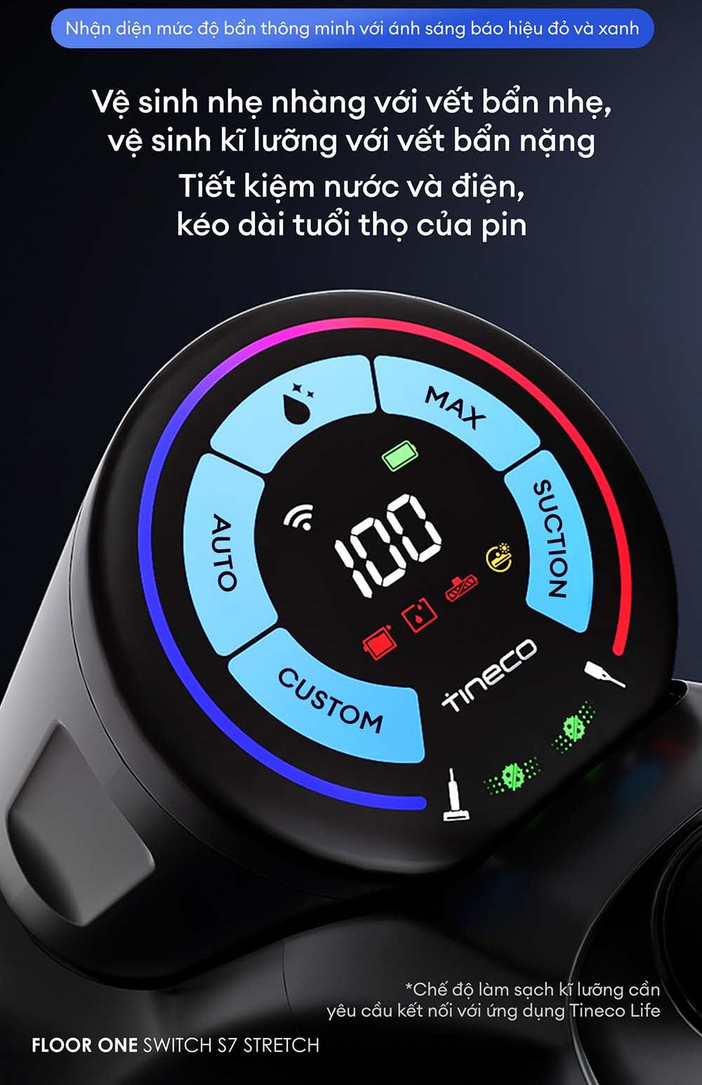 Tineco tích hợp hệ thống cảm biến ánh sáng nhận diện mức độ bẩn thông minh, giúp máy tự động điều chỉnh lực hút và lượng nước phù hợp theo từng khu vực: