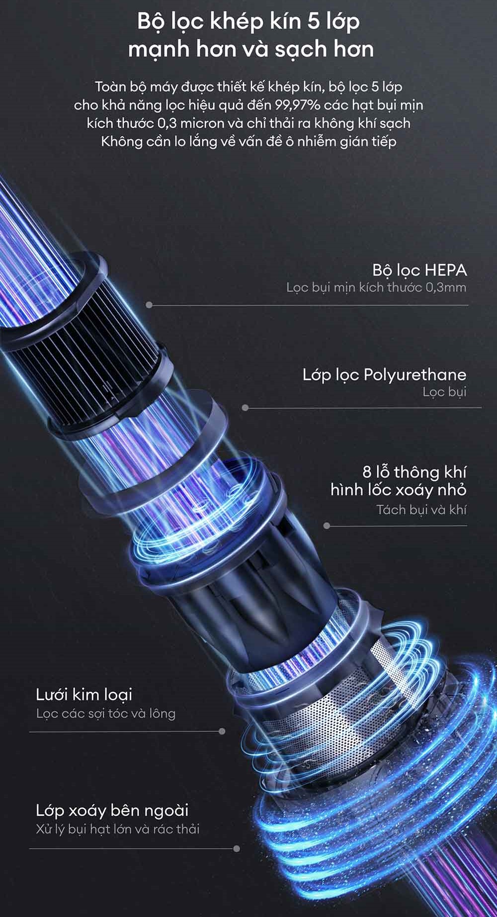 - Hệ thống lọc 5 lớp khép kín với hiệu quả lọc tới 99,97% bụi mịn 0.3 micron, đảm bảo không khí thải ra hoàn toàn sạch sẽ và không gây ô nhiễm ngược.