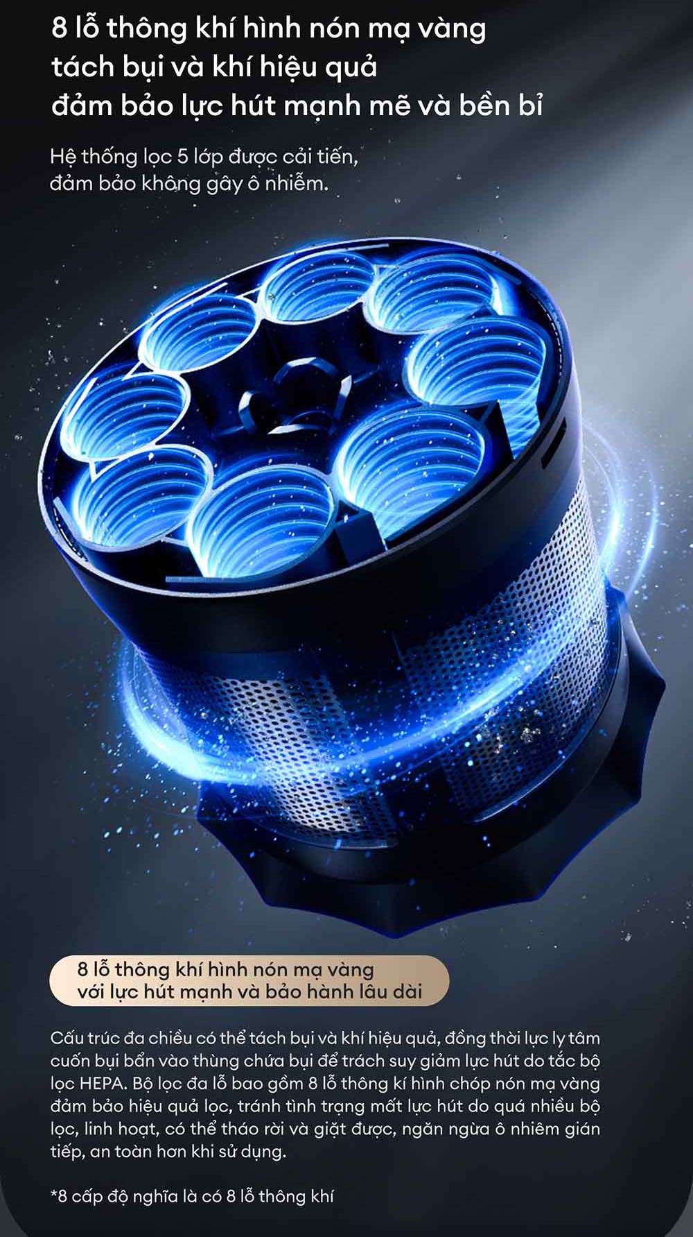 - 8 lỗ thông khí hình nón mạ vàng giúp tách bụi và khí tối ưu, bảo vệ lực hút bền bỉ.