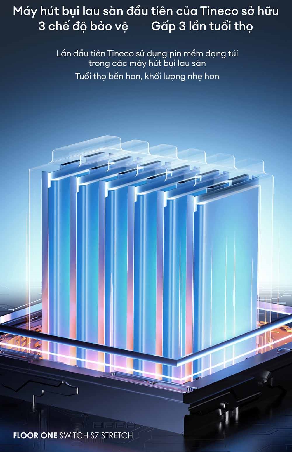 Máy hút bụi lau sàn Tineco Floor One Switch S7 được Tineco trang bị pin mềm dạng túi, mang lại trọng lượng nhẹ hơn nhưng lại sở hữu độ bền cao hơn gấp nhiều lần so với các loại pin thông thường. Nhờ 3 chế độ bảo vệ toàn diện, tuổi thọ của máy được cải thiện vượt bậc, cho phép người dùng sử dụng bền bỉ qua nhiều năm.