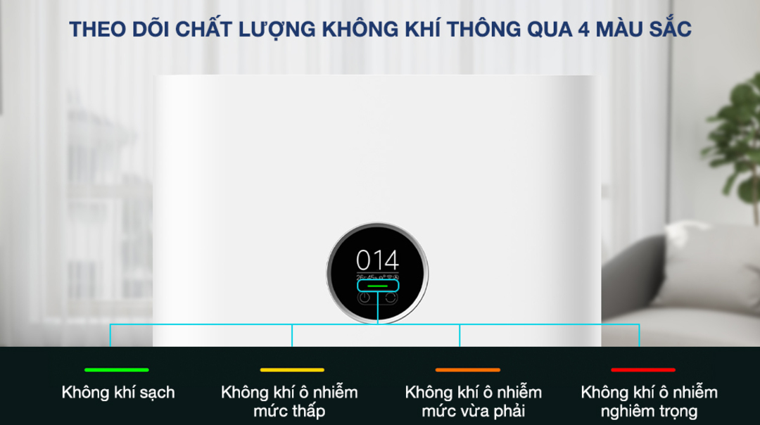 Máy lọc không khí Xiaomi Mi Air Purifier 4 được trang bị màn hình OLED cho phép người dùng dễ dàng quan sát tốt chất lượng không khí trong môi trường hiện tượng chỉ với một lần liếc nhìn. Các dữ liệu được hiển thị trên màn hình bao gồm chỉ số PM2.5, chỉ mã hóa màu với 4 màu sắc đại diện cho 4 mức độc chất lượng không khí khác nhau: