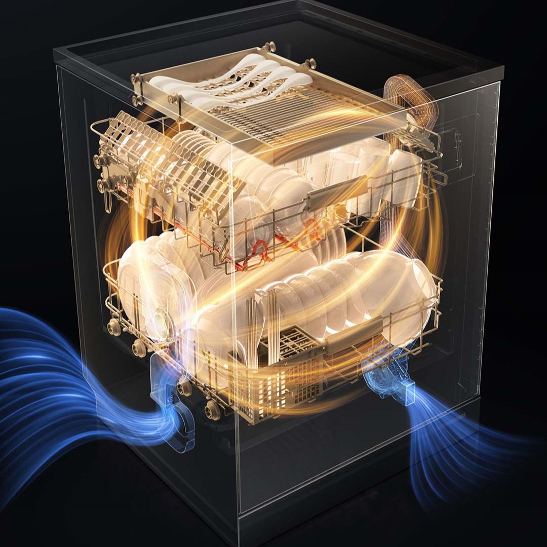 Quá trình sấy của máy rửa bát Xiaomi Mijia P1 được thực hiện qua 3 giai đoạn: Khi nóng PTC để đẩy nhanh quá trình bay hơi, cơ chế mở cửa tự dộng để thoát hơi nước và ngưng tụ nhiệt độ dư để hoàn tất việc sấy khô một cách nhanh chóng và hiệu quả, nhanh gấp 3 lần so với máy rửa bát thông thường.