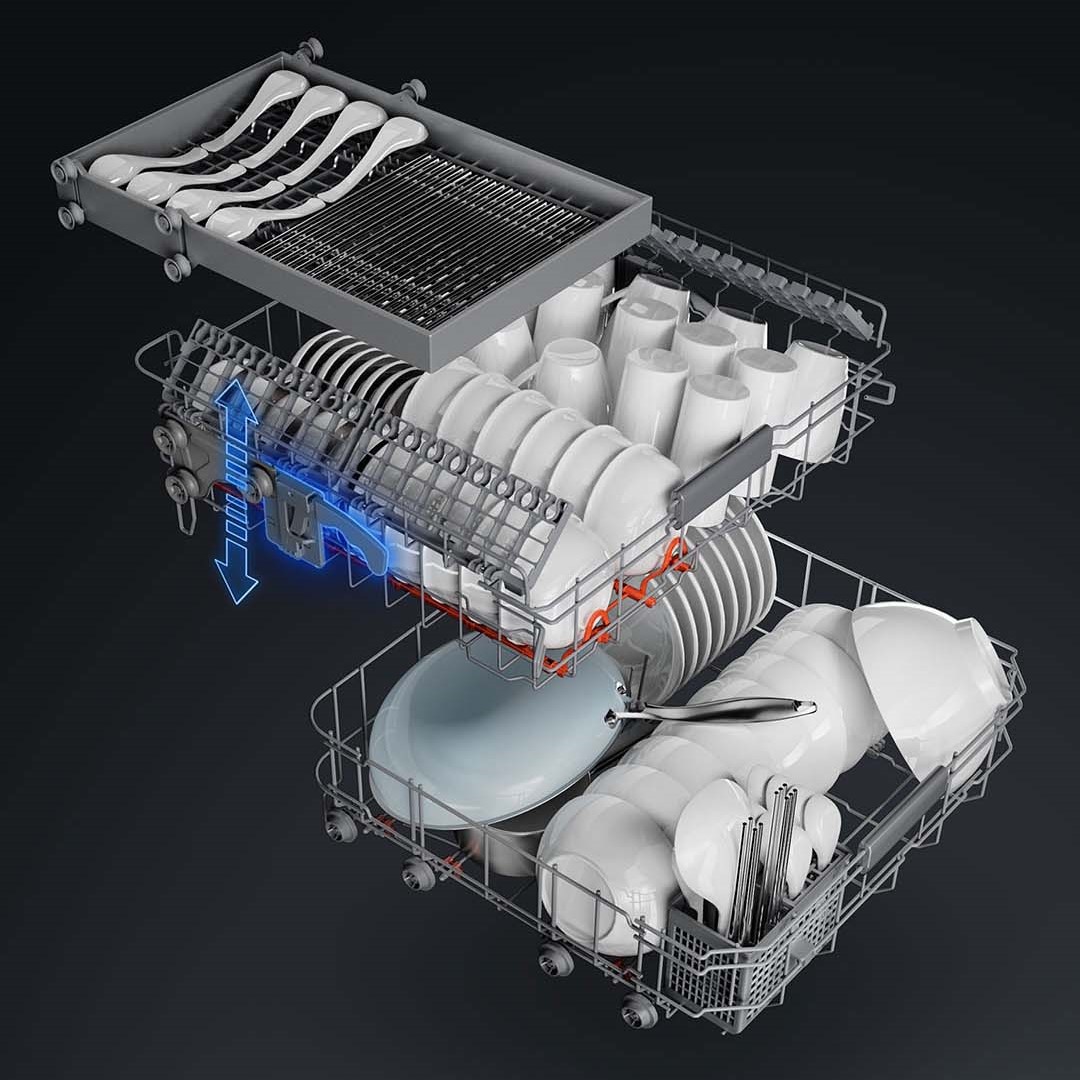 Máy rửa bát Xiaomi Mijia 16 bộ P1 có khả năng chứa tới 16 bộ chén đĩa và thiết kế 3 tầng tiện lợi với dung tích lớn, máy cho phép rửa linh hoạt, bất kể số lượng chén đĩa nhiều hay ít. Trong trường hợp có quá ít bát đĩa cần rửa, máy vẫn có thể hoạt động ở chế độ rửa tàng trên và tầng dưới riêng biệt giúp tiết kiệm điện nước và bạn cũng không cần tích trữ bát đĩa để rửa cực kỳ tiện lợi.
