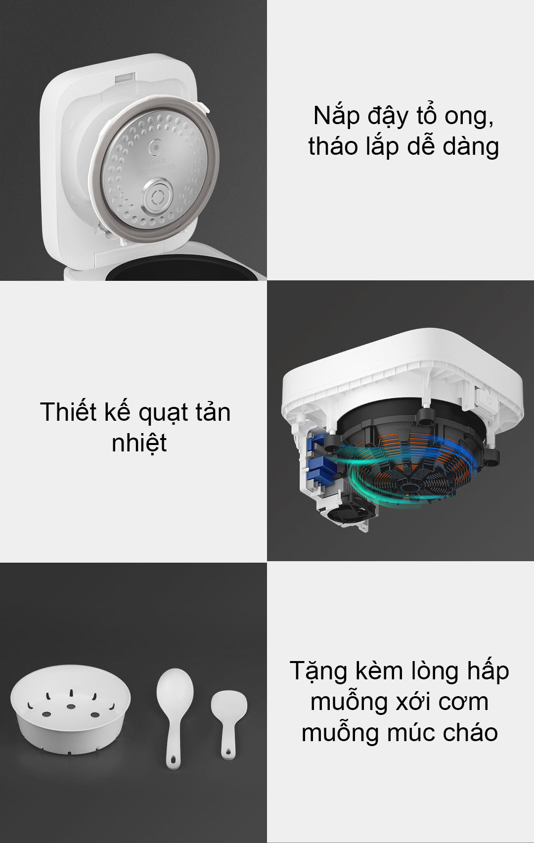 Nồi cơm điện Xiaomi sỡ hữu kích thước nhỏ gọn với màu trắng tối giản. Kèm theo là các chi tiết được tối ưu hóa để nâng cấp trải nghiệm người dùng như quạt tản nhiệt, nắp tháo rời và đi kèm nhiều món đồ tiện dụng khác như vỉ hấp, muỗng múc cháo, muỗng múc cơm.