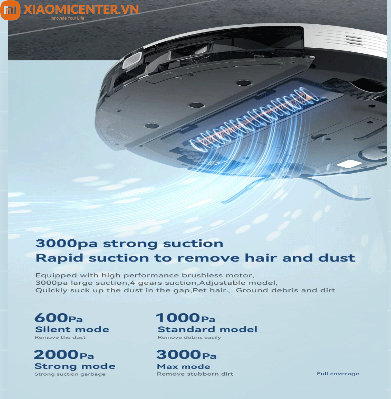 Robot hút bụi lau nhà Xiaomi Vacuum Lydsto R3 sở hữu động cơ không chổi than Nidec đến từ Nhật Bản cho lực hút lên tới 3.000 Pa, đáp ứng mọi nhu cầu làm sạch. Bộ lọc HEPA nâng cao tác dụng trong việc lọc bụi mịn có kích thước nhỏ chỉ 0.3 micromet, ngăn chặn không cho bụi mịn và một số vi khuẩn có hại thoát ra bên ngoài môi trường. Ngoài ra, Xiaomi Lydsto R3 còn được trang bị tính năng điều khiển tới 4 chế độ khác nhau giúp người dùng có thể điều khiển phù hợp như 600pa, 1000pa, 2000pa và max 3000pa. ![]()