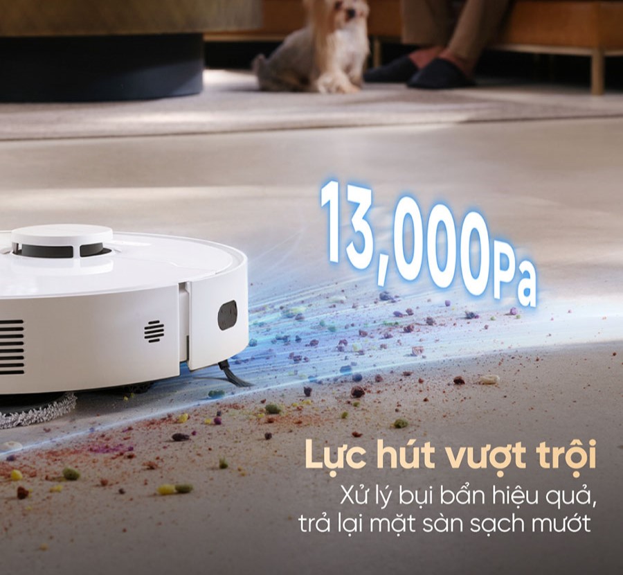 Robot hút bụi lau nhà Dreame D20 Ultra được trang bị lực hút Vormax™ lên đến 13.000Pa – một sức mạnh ấn tượng, cho phép robot hút sạch mọi loại bụi bẩn từ bụi mịn, tóc, lông thú cưng đến các mảnh vụn lớn. Công nghệ Vormax™ không chỉ tạo ra luồng không khí mạnh mẽ, mà còn duy trì lực hút ổn định suốt quá trình dọn dẹp, đảm bảo từng milimet sàn nhà đều được làm sạch hoàn hảo mà không bỏ sót bất kỳ khu vực nào, kể cả những nơi khó tiếp cận nhất. Đây là lựa chọn lý tưởng cho các gia đình có nhiều thú cưng hoặc không gian dễ bám bụi.
