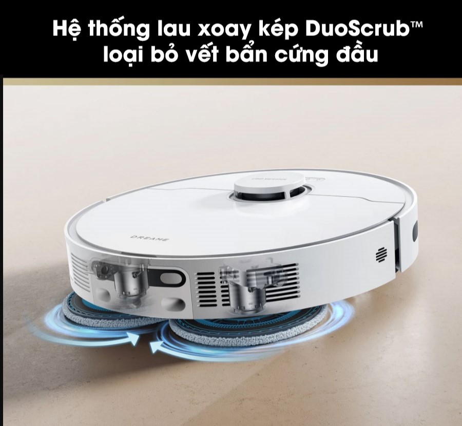 Robot hút bụi lau nhà Dreame D20 Ultra sở hữu hệ thống DuoScrub™ với hai đĩa lau quay ngược chiều, tạo ra lực ép mạnh mẽ giúp đánh bật mọi loại vết bẩn cứng đầu như vết trà, cà phê, dầu mỡ… Hệ thống này hoạt động dựa trên nguyên lý ma sát kép, mô phỏng chuyển động lau nhà bằng tay nhưng với tốc độ nhanh gấp nhiều lần. Nhờ đó, không chỉ loại bỏ bụi bẩn mà sàn nhà còn được đánh bóng nhẹ nhàng, giữ cho bề mặt luôn sáng bóng và không bị trầy xước.
