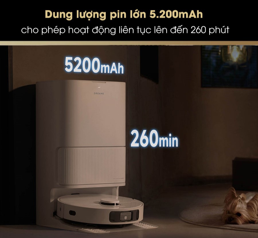Robot hút bụi Dreame D20 Ultra được trang bị dung lượng pin lớn 5.200mAh, cho phép hoạt động liên tục lên đến 260 phút chỉ sau một lần sạc. Với khả năng sạc nhanh tiên tiến, robot sẽ rút ngắn đáng kể thời gian nạp pin, từ đó giảm thời gian chờ đợi và luôn sẵn sàng cho mọi nhiệm vụ làm sạch. Đặc biệt, khi pin gần hết, robot sẽ tự động quay về dock sạc để nạp năng lượng, sau đó tiếp tục làm sạch những khu vực chưa hoàn thành mà không cần sự can thiệp của người dùng.