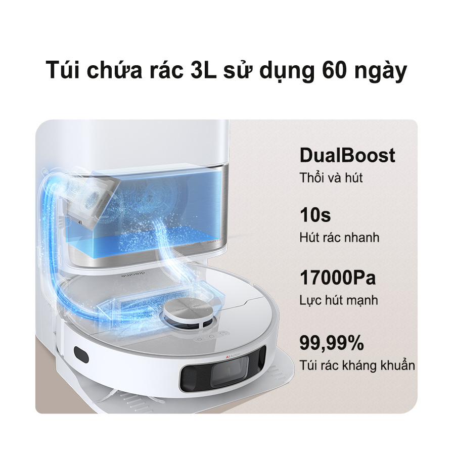 Dreame L10 Ultra có hệ thống tự động đổ rác sử dụng công nghệ DualBoost 2.0 độc quyền để thổi không khí vào hộp chứa rác của robot và hút bụi vào túi chứa rác 3L. Nhờ hệ thống này mà robot có thể làm sạch hộp chứa rác với tốc độ cao, tiếng ồn tối thiểu và hầu như không bị tắc nghẽn. Ngoài ra, khu vực ướt để làm sạch giẻ lau và khu vực khô để hút bụi từ ngăn chứa rác được tách biệt hoàn toàn, nhờ vậy mà giảm được nguy cơ vô tình hút nước vào.