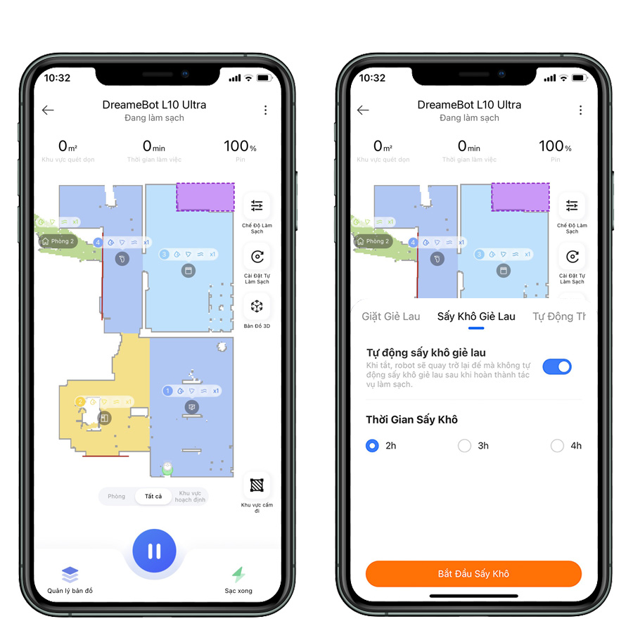 Dreame L10 Ultra được trang bị các chế độ tự động hàng ngày giúp hút bụi và lau nhà cho các phòng và khu vực theo thời gian đặt trước. Ngoài ra, robot cũng tự động làm trống ngăn chứa bụi sau mỗi lần hoạt động hoặc sau 2 hoặc 3 lần hoạt động. Để đảm bảo sự khô ráo cho giẻ lau, Dreame L10 Ultra cũng tự động làm khô giẻ lau sau khi robot trở về trạm sạc một khoảng thời gian định trước (2h, 3h, 4h).