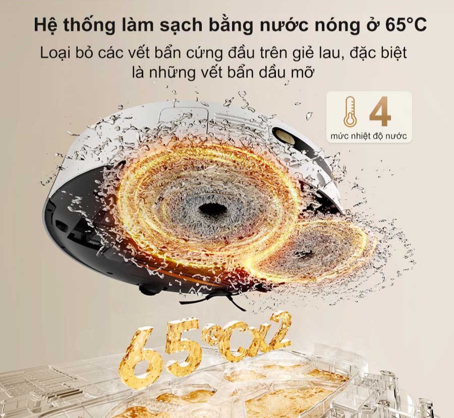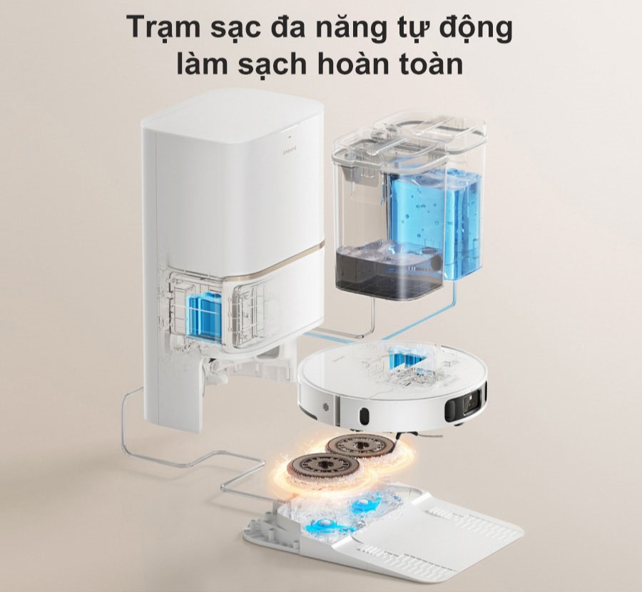 Đặc biệt, trạm sạc của Robot Dreame L30s Ultra được trang bị hệ thống làm sạch bằng nước nóng 65°C, giúp loại bỏ các vết bẩn cứng đầu trên khăn lau, kể cả vết bẩn dầu mỡ. Hơn nữa, tính năng tự động làm khô khăn lau còn loại bỏ hơn 99% độ ẩm, giúp ngăn ngừa mùi hôi khó chịu, giữ cho khăn lau luôn sạch sẽ và sẵn sàng cho lần sử dụng tiếp theo.