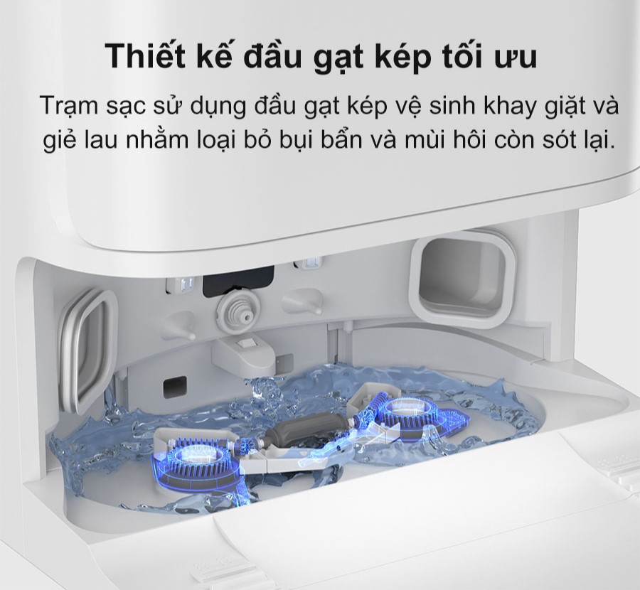 Trạm sạc của Dreame L30s Ultra được trang bị đế giặt tự làm sạch tiên tiến với 2 cần gạt xoay, giúp loại bỏ triệt để bụi bẩn còn sót lại trên khăn lau và đế giặt. Hệ thống tự làm sạch này có khả năng loại bỏ 99% bụi bẩn, ngăn ngừa mùi khó chịu, đảm bảo robot luôn ở trạng thái sạch sẽ và sẵn sàng cho lần hoạt động tiếp theo.
