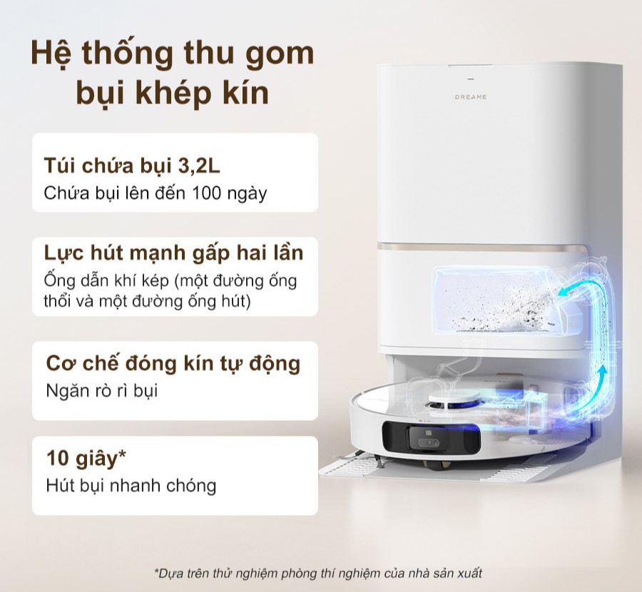 Hệ thống tự động thu gom bụi của Dreame L30s Ultra được thiết kế tiên tiến với khả năng lưu trữ bụi lên đến 100 ngày. Với hai ống dẫn khí tạo thành vòng tuần hoàn khép kín, hệ thống này ngăn ngừa rò rỉ bụi bẩn từ hộp bụi, miệng hút và túi đựng bụi. Túi thu gom bụi dung tích 3.2L không chỉ có khả năng tiêu diệt 99.9% vi khuẩn mà còn lọc các chất gây dị ứng, đảm bảo không khí trong nhà luôn trong lành. Hệ thống hút kép với hai ống dẫn khí – một ống thổi và một ống hút, giúp thu gom bụi nhanh chóng chỉ trong 10 giây, mang lại sự sạch sẽ tối ưu cho ngôi nhà của bạn.