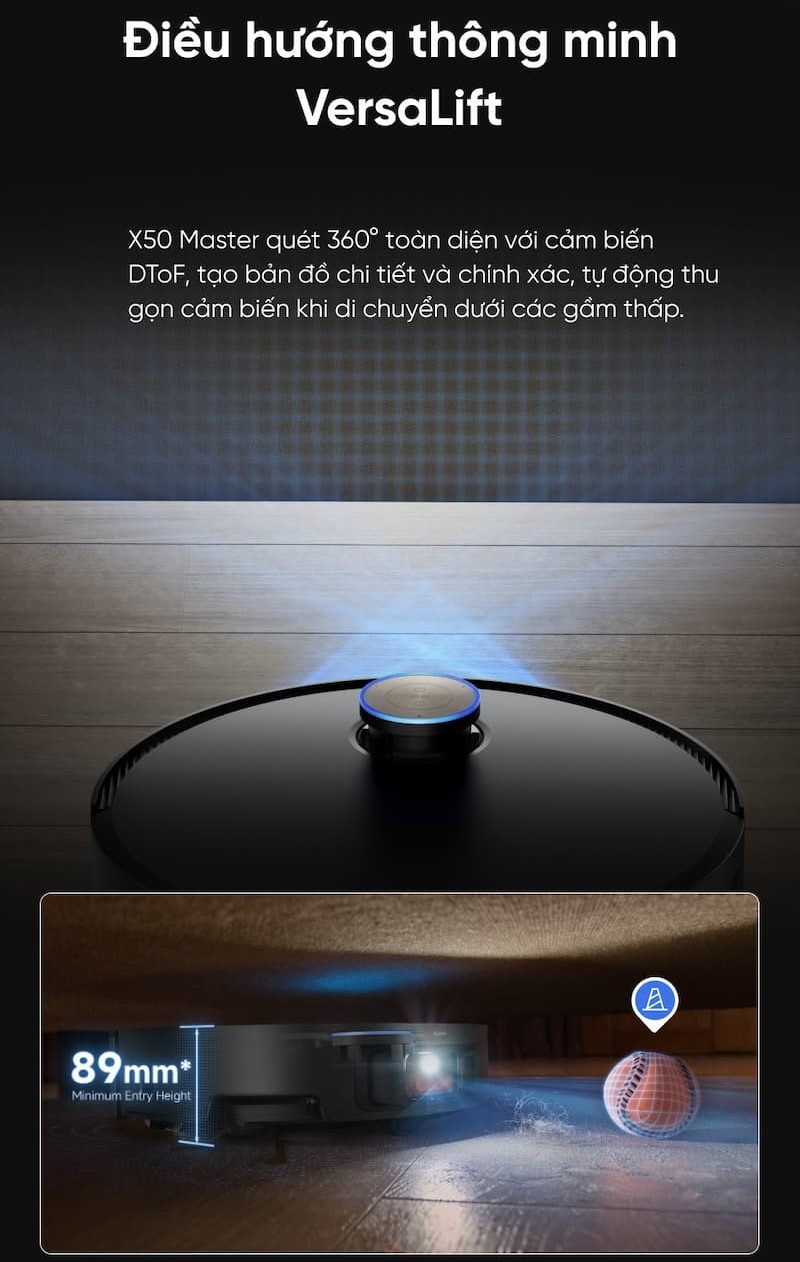 Cơ chế VersaLift™ kết hợp cảm biến DToF có khả năng thu gọn xuống chỉ 89 mm để lướt nhẹ dưới gầm sofa, giường và bàn ghế thấp, rồi nâng cao khi cần tránh chướng ngại vật. Hệ thống quét 360° cùng LiDAR và AI tạo bản đồ siêu chi tiết, tối ưu lộ trình làm sạch, ngăn robot bị kẹt hoặc đi vòng lặp thừa. Khi gặp vật cản cao đến 6 cm, VersaLift™ nhanh chóng đổi hướng, đảm bảo hoạt động liên tục mà không gián đoạn.