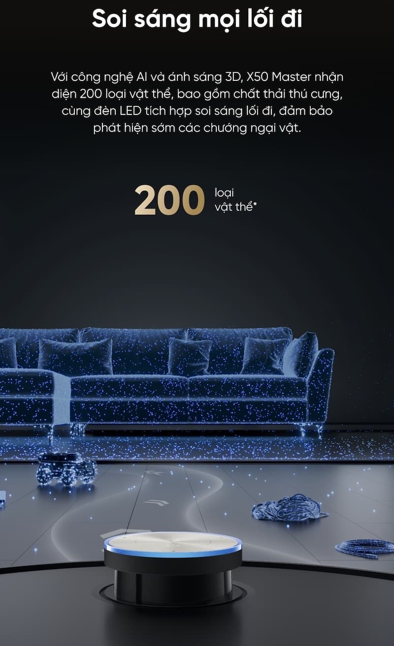 Dreame X50 Master tích hợp công nghệ AI kết hợp cảm biến ánh sáng 3D tiên tiến, cho khả năng nhận diện chính xác hơn 200 loại vật thể như dây điện, giày dép hay đồ chơi nhỏ. Hệ thống đèn LED chiếu sáng thông minh hỗ trợ robot quan sát rõ trong điều kiện ánh sáng yếu, giúp phát hiện và né tránh vật cản nhanh chóng.